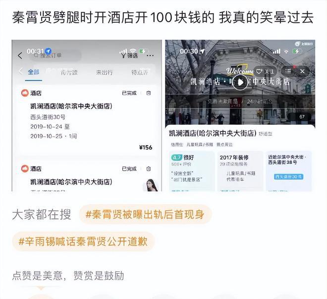 其中最引人注目的就是,秦霄贤出轨时去的酒店,全都是一百多的平价酒店。