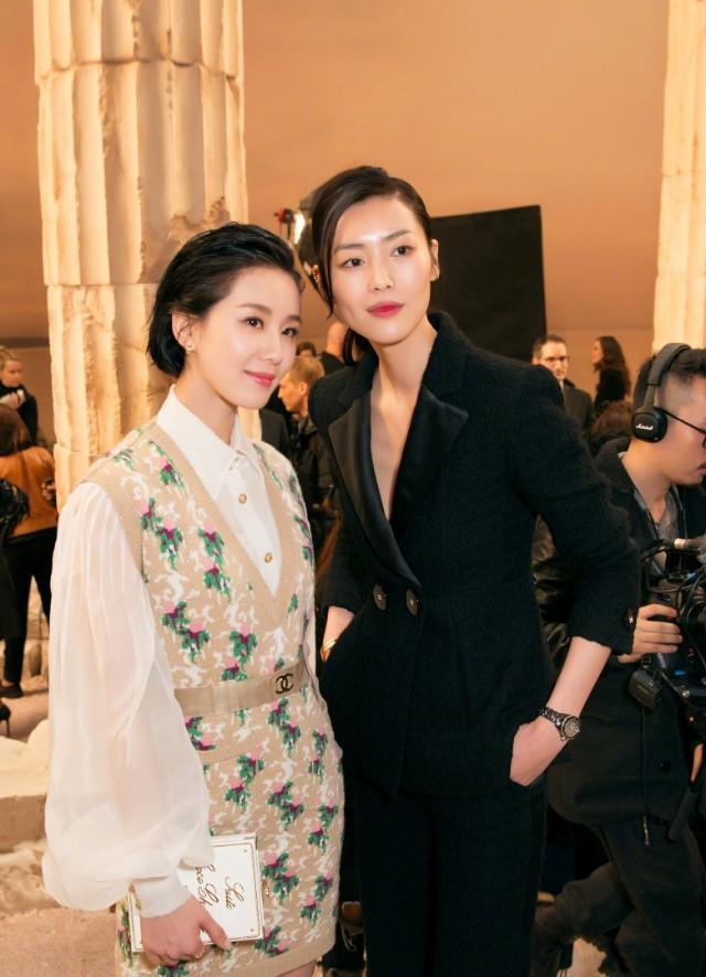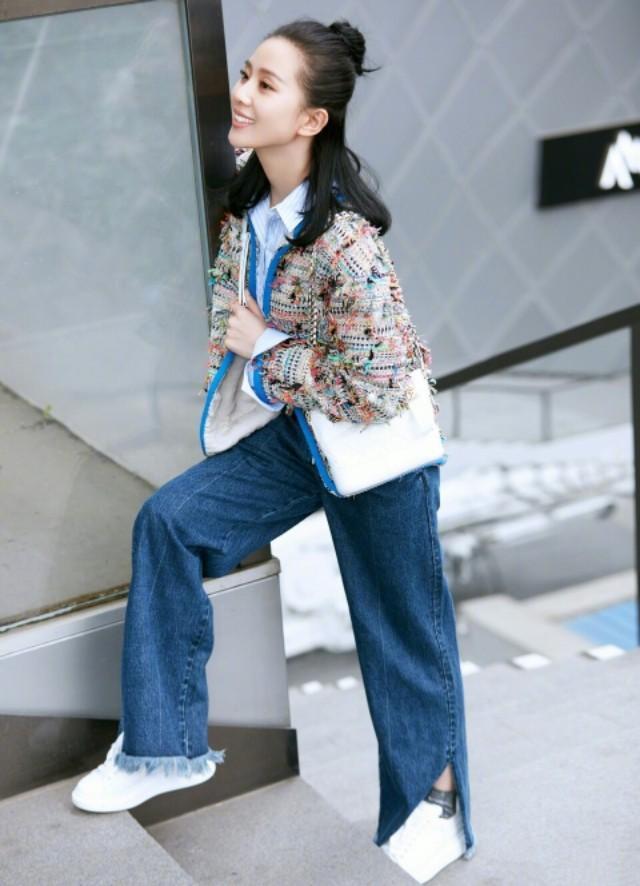 穿一件白衬衣搭配驼色印花短针织裙,本来气质温婉的诗诗,却是依旧有大气场。梳个大背头,气场却一点不输大表姐刘雯。