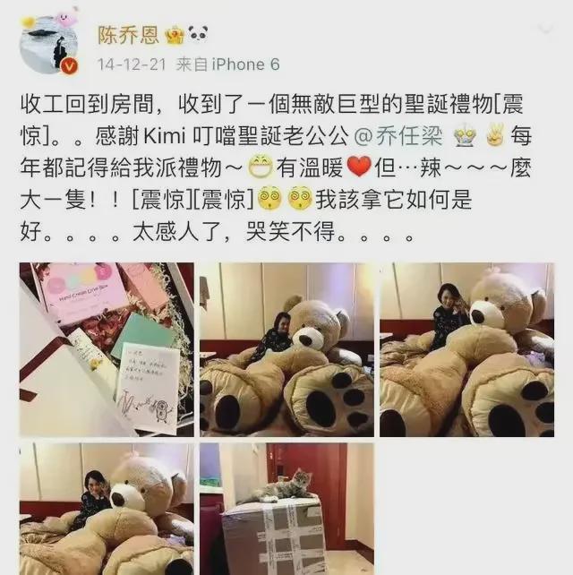在横店拍戏时,陈乔恩收到一个巨型快递,打开后看到粉红色的温馨卡片,还有足足 3 米高的玩具熊,瞬间猜到是乔任梁送自己的圣诞礼物。