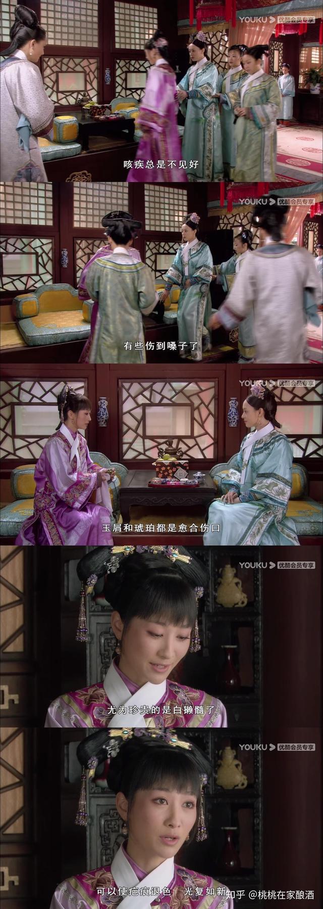 不信大家来看接下来的剧情,当甄嬛揽镜自照,不知道该用什么治疗伤口后,安陵容甜笑着款款而来。