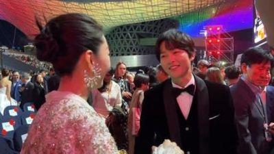 在釜山电影节的后台,宋仲基身穿干练的西装,显得格外精神;而周冬雨则以一袭白色礼服惊艳亮相,端庄优雅。两人在聊天时满脸笑意,虽然语言隔阂依然存在,但彼此的魅力却将这层障碍悄然打破。网友们纷纷赞叹“男帅女美”,对这对优秀演员的欣赏之情溢于言表。