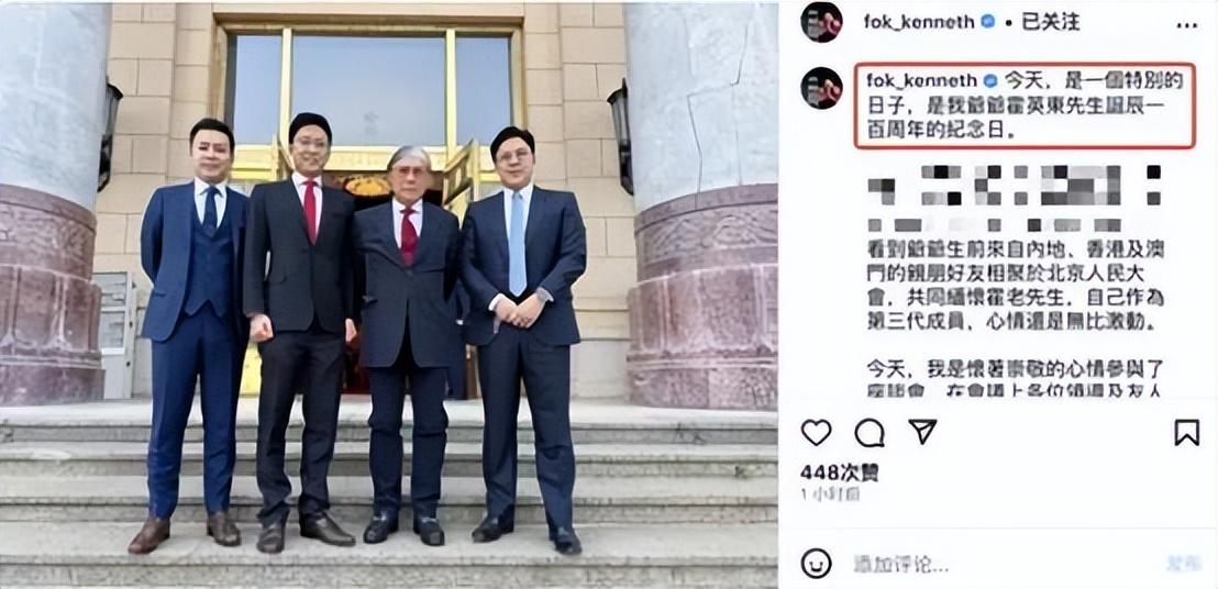 5月10日,霍启刚更新了自己的社交账号,罕见的晒出了自己和父亲霍震霆以及两个兄弟霍启山、霍启仁同框的画面。他表示今天的日子非常特别,是爷爷霍英东诞辰一百周年的纪念日。