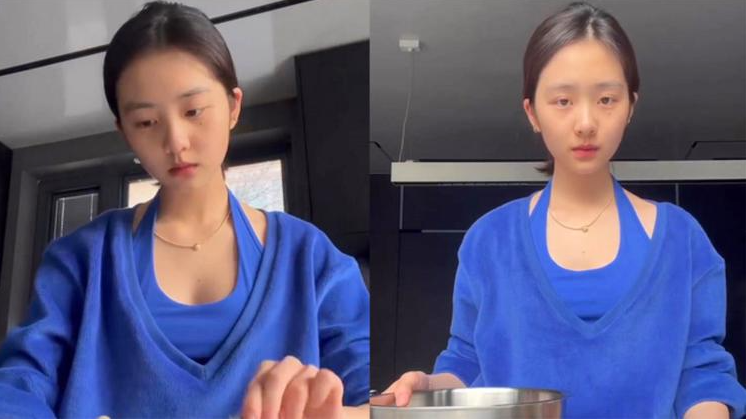 视频中,是黄多多在家做泡芙的过程,只见她身穿套头蓝色运动衣,一直低头俯身,专心做着泡芙。