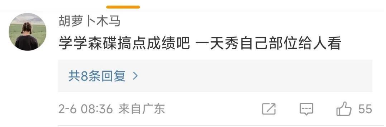 还有网友说:“学学人家森碟做出点成绩来,别总晒自己的身体部位”。