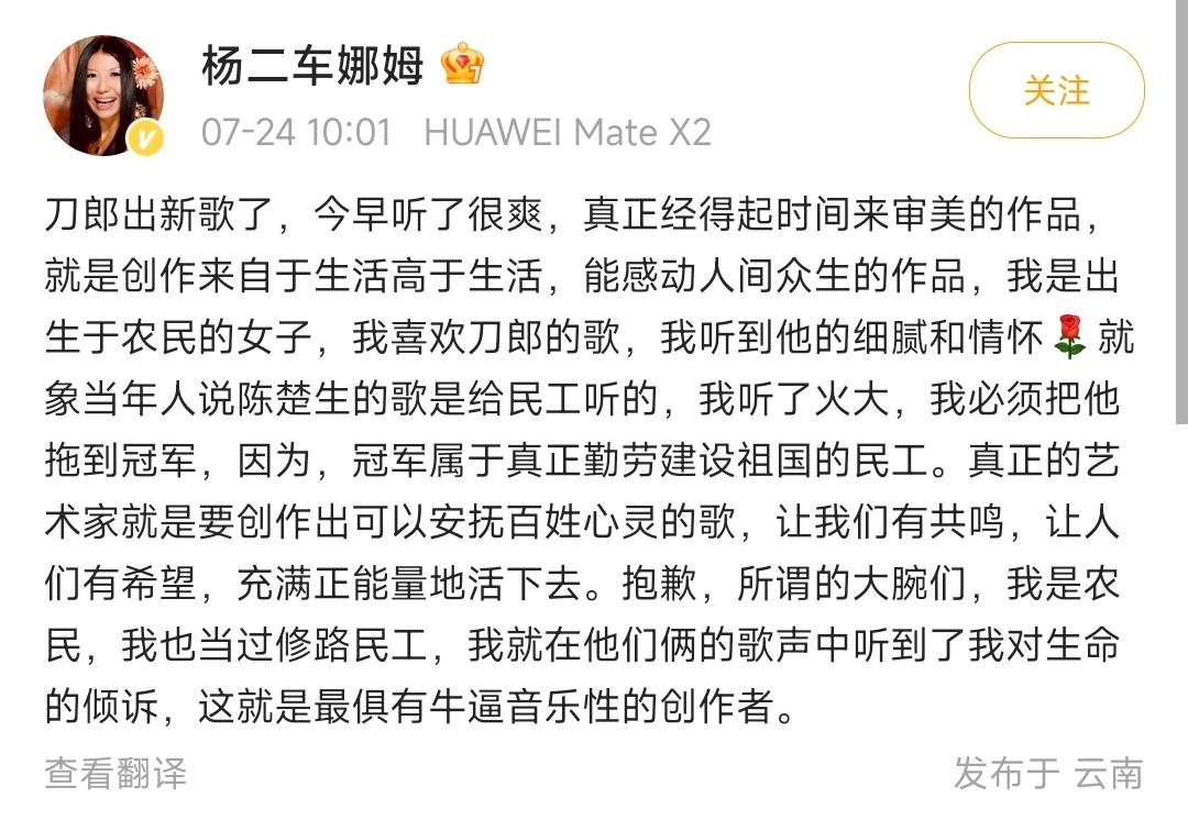 7月24日,美国国籍作家、《快乐男声》评委、知名歌手杨二车娜姆在个人账号上公开发文力挺歌手刀郎,重新提到了农民音乐审核的事情,引发了网友的热议。