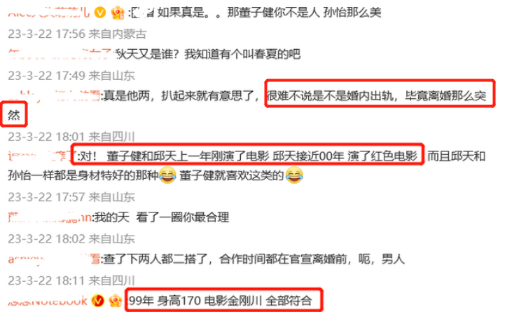 评论区有网友猜测是这两人后迅速引发巨大讨论,董子健邱天两人恋情疑似被曝的重点除了二人正在恋爱外,更为关键的是时间线。董子健和孙怡在8月官宣离婚的消息,时间线刚好和两人二搭入组前后脚,十分巧合,引发网友猜测。