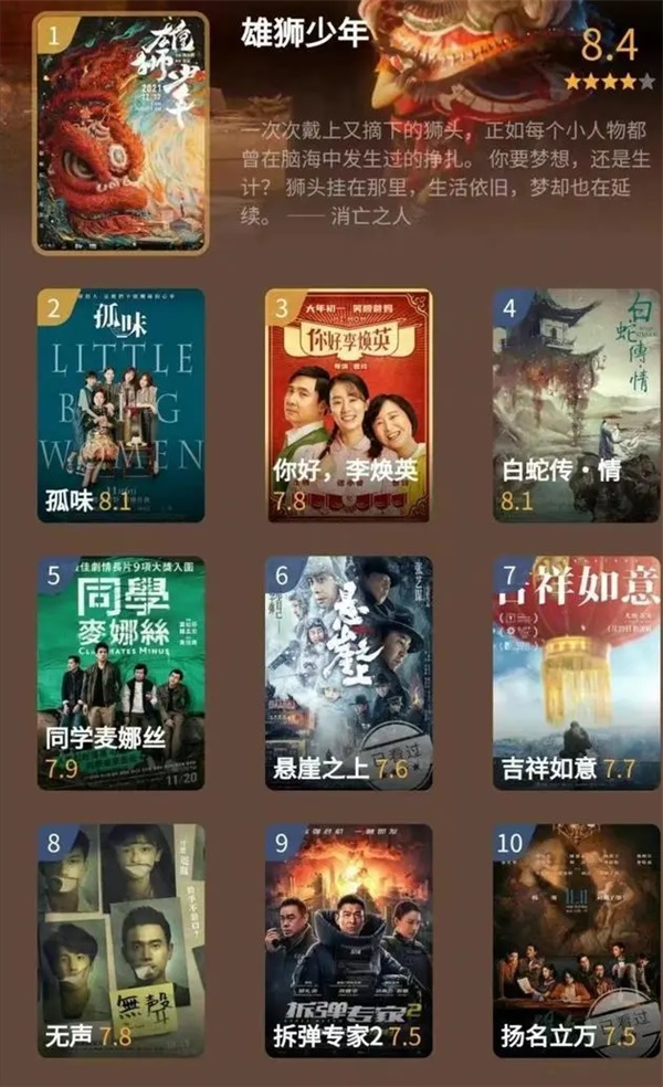 《雄狮少年》选择了以“舞狮”这项传统民间艺术作为主题,讲述一个留守少年如何通过“舞狮”逐渐成长的故事,并且场景设定还选择在广东地区,再加上整部电影有许多致敬港片、周星驰等桥段,曾一度被认为将会成为下一个票房奇迹。