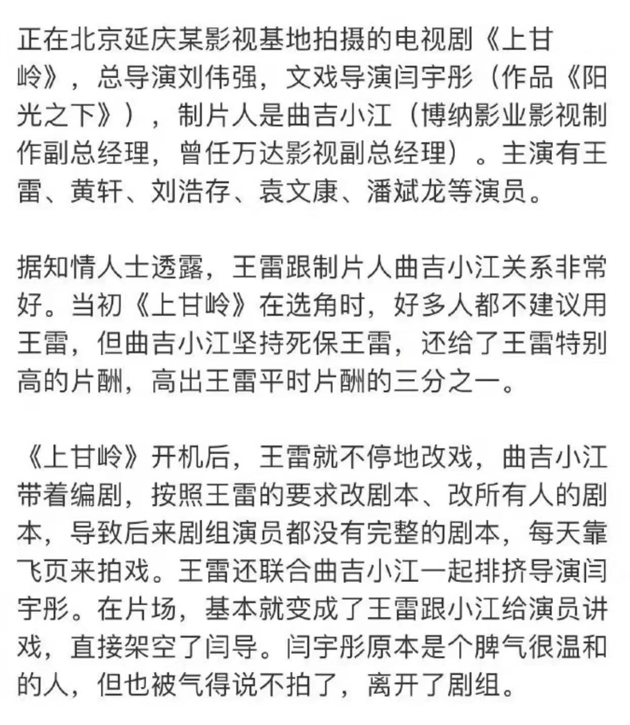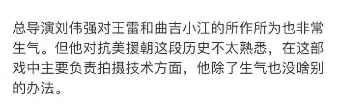 可是《上甘岭》开拍后,王雷不停地改剧本,不仅占用了其他演员的戏份,甚至还和曲吉小江一起排挤导演闫宇彤,气得对方直接离开了剧组。