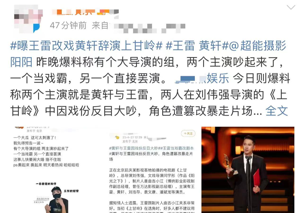 4月27日,有媒体爆料黄轩和王雷因戏份反目成仇,在剧组便当众吵了起来,引发网友热议。