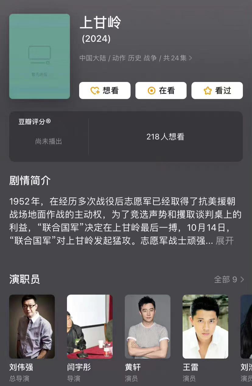 据悉,刘伟强导演的电视剧《上甘岭》正在拍摄中,黄轩和王雷都是剧中主演,此外刘浩存、袁文康、潘斌龙也参与参与了拍摄。