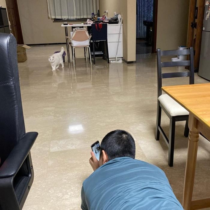 照片中papi酱的家非常整洁干净,而老胡一头短发干净清爽,可以看出来他的体格比较强壮,家居服裹得紧紧的,正专心致志地趴在地上给家里的白猫"大咪"拍照,papi酱除了自己的社交账号,还运营着一个更新自家两只猫咪动态的账号,叫做:"papi酱的大小咪",已经收获了上百万粉丝,其中大咪和老胡亲,小咪和papi酱亲,papi酱曾自爆,老胡还给大咪取大名叫胡德正,小咪叫姜发财。这次老胡给猫咪拍照,可能也是为了更新账号动态,相信过不了多久大家就可以看到老胡拍的可爱的猫咪照片了。