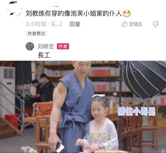 当天的刘畊宏穿着深蓝色的练功服,虽然服装朴素但结实的肌肉露在外面一下就有保镖那味儿了,站在小泡芙身边好像一个看家的护卫。于是有网友打趣道他像泡芙小姐家的仆人,刘畊宏便自嘲地回复 " 长工 ",这样一看,家庭地位一目了然呀。