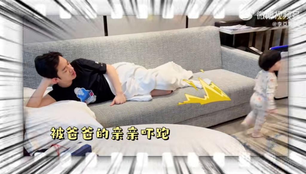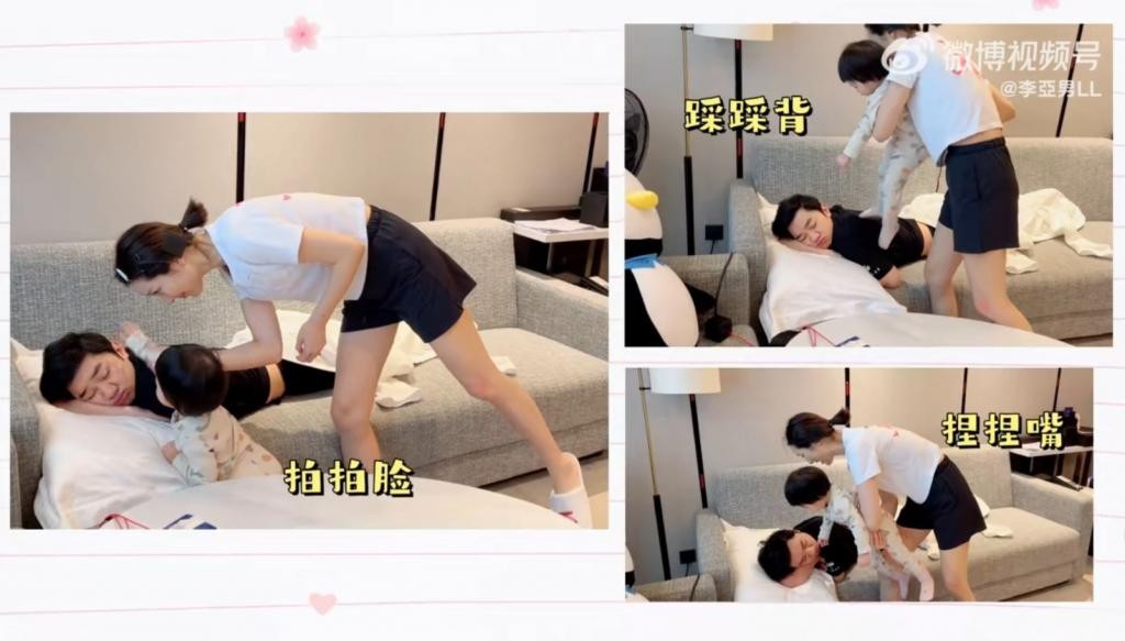 第一幕就是李亚男带着小女儿 Hayley,一起叫醒正在沙发上趴着睡觉的王祖蓝。小女儿先模仿妈妈的动作,用手在爸爸背上轻轻拍打着。然后她被妈妈横腰抱住,伸手去捏住爸爸的嘴唇。