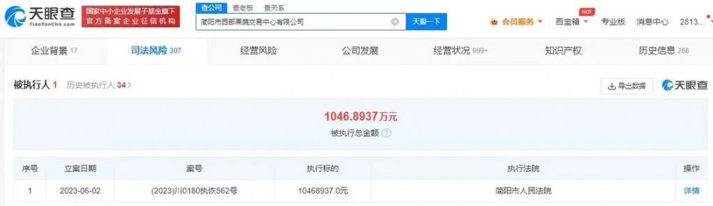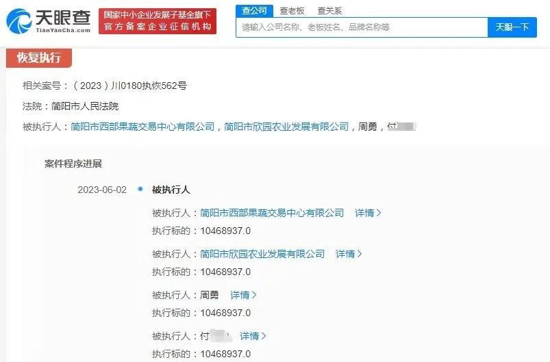 天眼查 App 显示,近日,周勇、简阳市西部果蔬交易中心有限公司、简阳市欣园农业发展有限公司、付某某新增一则恢复执行信息,执行标的 1046 万余元,执行法院为简阳市人民法院。