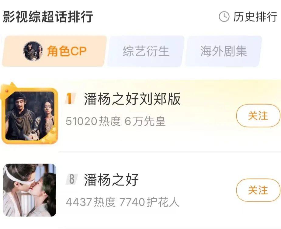 更关键的是,她和剧中男主的 cp「潘杨之好刘郑版」登上角色 cp 榜 1 ⬇️