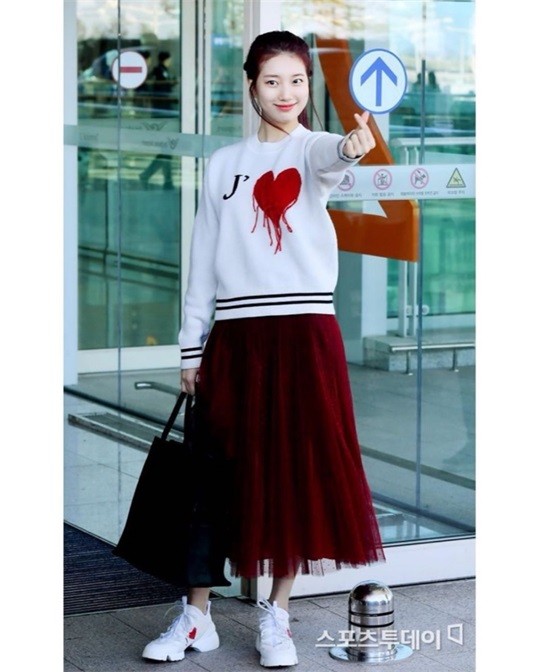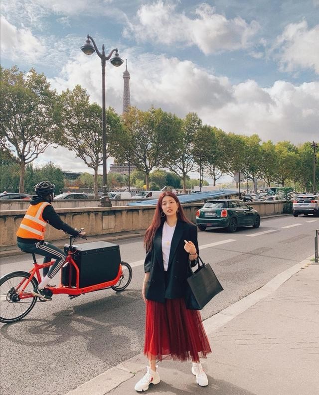 又仙又美的红色纱裙,搭得太少女,过于甜腻;搭得太性感,过于俗气;秀智搭配中性西装,风格互补,帅气而不失女性魅力。