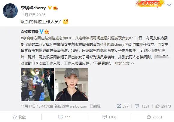 17 日,李晓峰发文回应和刘恺威恋情 :" 联系的哪位工作人员?" 这下网友都炸了,这是什么意思,难道工作人员说的不是真的?这是要承认恋情吗?难道另有隐情?