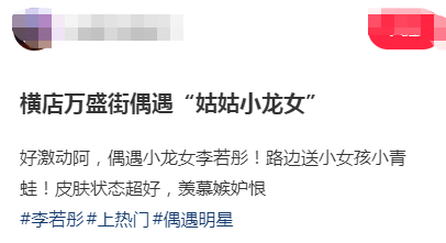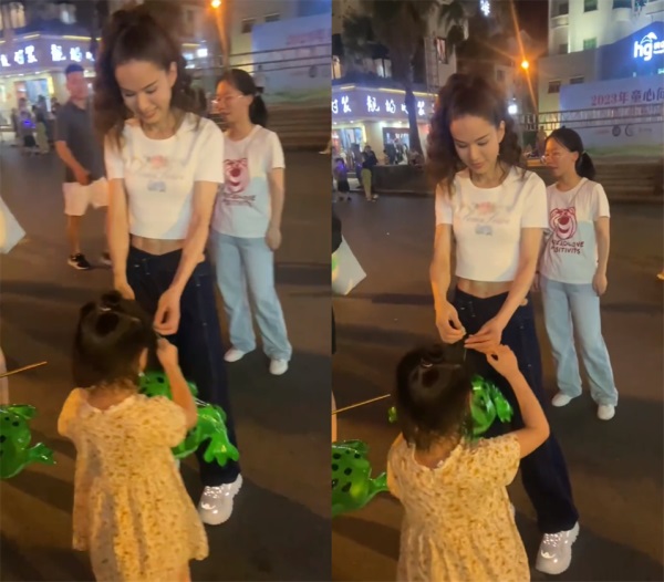 当时她正站在街边上,身边有一个跟着妈妈的小朋友,而她正在从“卖仔青蛙”手里买下了一只青蛙,送给了小女孩儿。小女孩儿在妈妈的引导下,称呼李若彤为姐姐,当时她听到后非常开心。