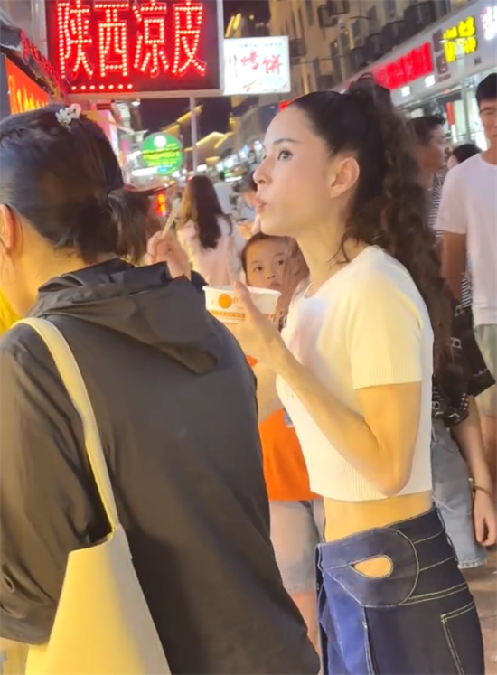 之后李若彤跟自己的助理一路走一路逛,来到小摊面前买了很多小吃,两个人非常专心的吃着,远远看上去,完全就是一个年轻的小女孩儿。