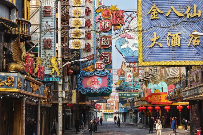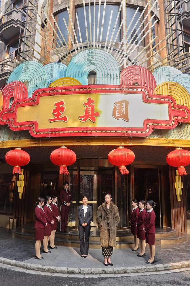 来到现实中的片场,位于车墩影视基地的 " 黄河路 " 店招林立,但没了夜晚霓虹灯的闪耀,这些店铺招牌像是卸去了浓妆,灯管上残留着被铁锈侵蚀的痕迹,更有一种现实气息和年代感,连路口的重要场景 " 至真园 " 也显得 " 朴实无华 "。但电视剧中让人惊叹的场景真真切切诞生于此。