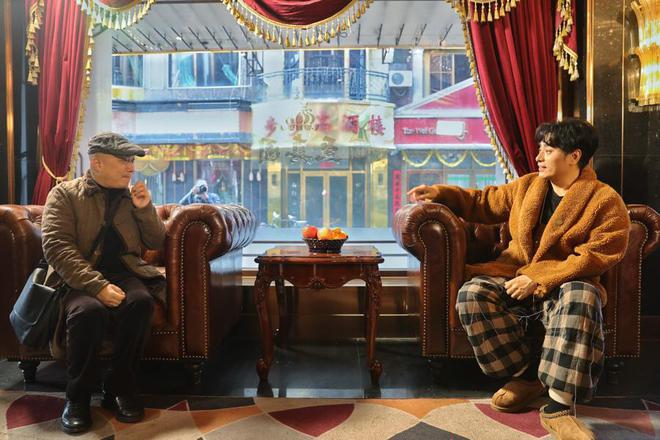 《繁花》联合导演程亮(左)和剧中演员陈龙(右)在至真园酒店内回忆拍摄情景。
