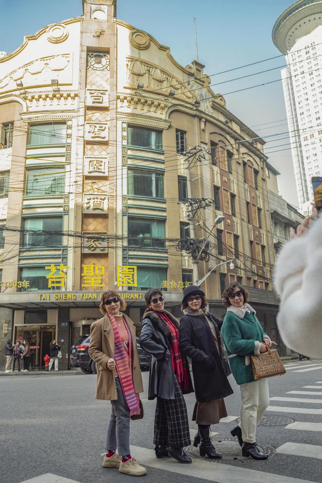" 这剧太火了,我们就相约来黄河路怀旧。" 沈萍和姐妹们在苔圣园酒家门口摆 pose 留影。沈阿姨年轻时在金融行业工作," 白天我们做银行业务,晚上被安排去做证券轧账。上世纪 v90 年代初股票行情太火爆了,常常加班到凌晨,行长会派人到黄河路买夜宵给大家吃,他们回来告诉我黄河路如何如何…… "