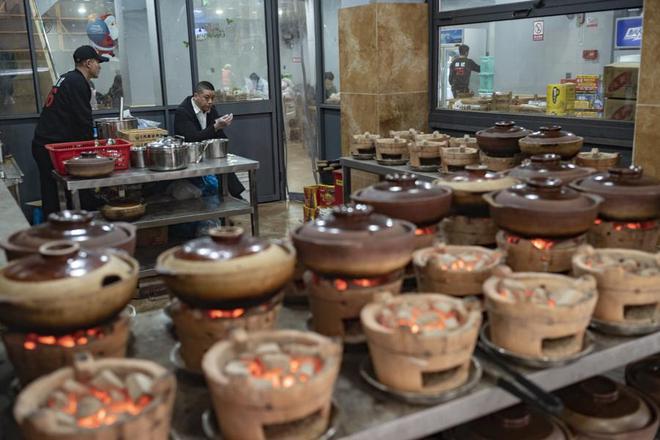 如今老板阿明(左一)接替父亲承担了大部分饭店的经营事务。