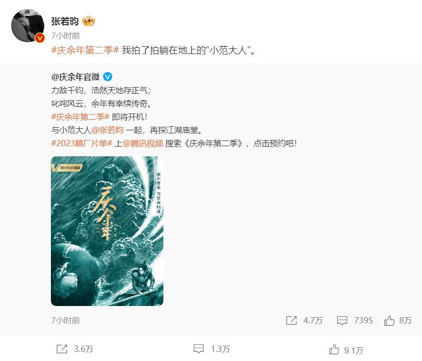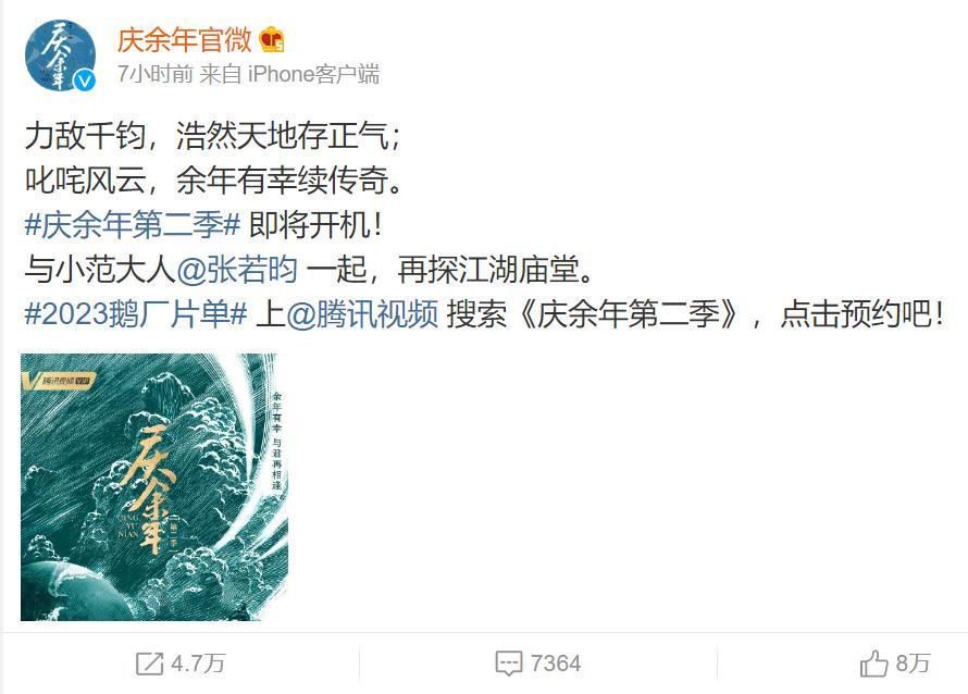 《庆余年》剧组微博发文“力敌千钧,浩然天地存正气;叱咤风云,余年有幸续传奇。庆余年第二季即将开机!与小范大人张若昀 一起,再探江湖庙堂”,这一条微博令人激动,而且随后它还表示2023年鹅厂的片单,也就是说这部剧很可能要在明年播出了。