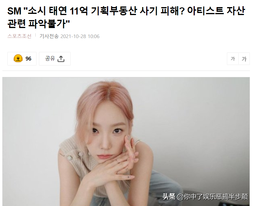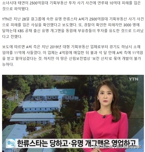 2021年10月28日,大量韩国媒体报道少女时代成员金泰妍卷入了2500亿韩元的房地产诈骗案,个人损失11亿韩元,引起大量网友关注,纷纷留言安慰金泰妍。
