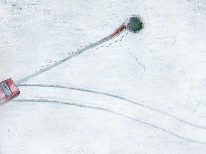 寂静的雪地里,一辆红色的汽车打破了原本的宁静,蜿蜒驶过的车辙带有血迹,雪面上的冰窟窿更是将悬疑气氛拉满。
