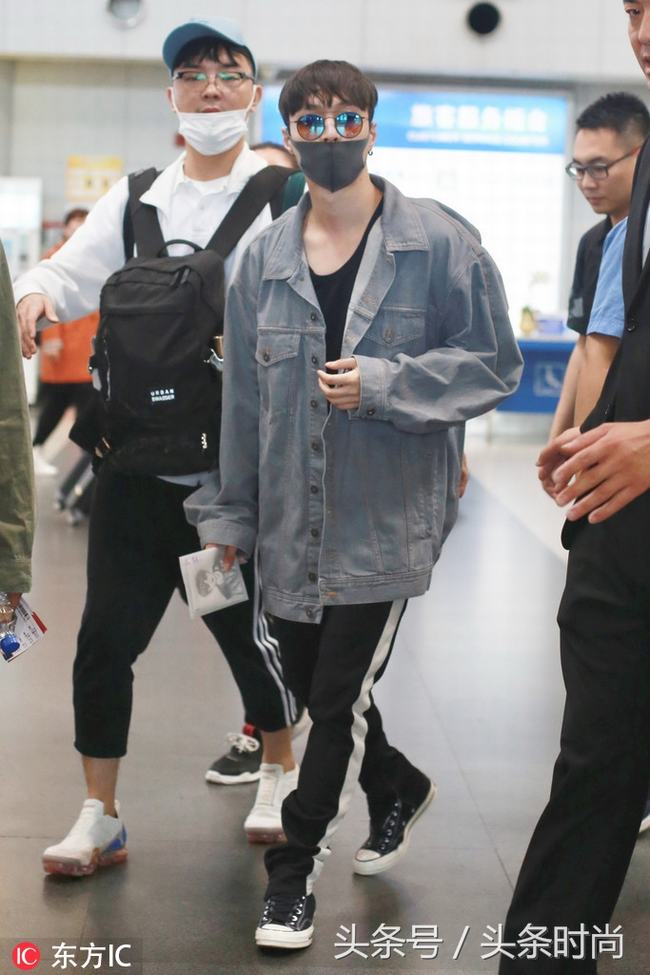张艺兴黑tee 牛仔外套时髦帅气,帆布鞋 茶色墨镜精致有型。