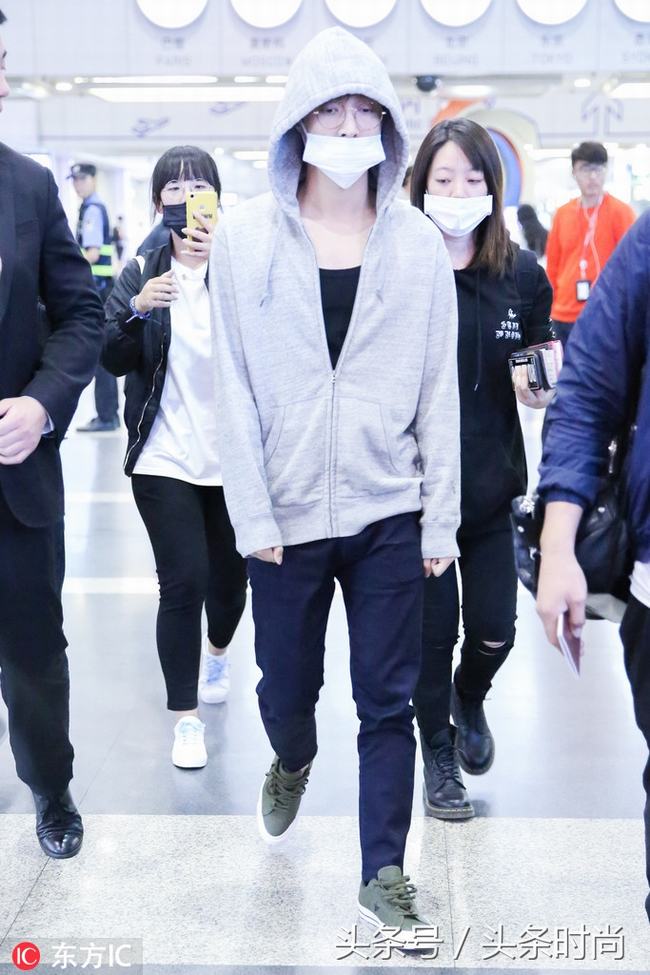 张艺兴黑色Tee 灰色帽衫套头慵懒随性,蓝色窄腿裤 绿色运动鞋时髦吸睛。