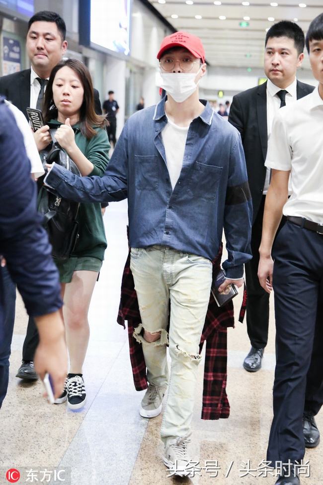 除了西装,张艺兴平时的穿搭也相当帅气,这身蓝衬衫 红色棒球帽玩撞色,破洞牛仔裤配运动鞋演绎阳光男孩。