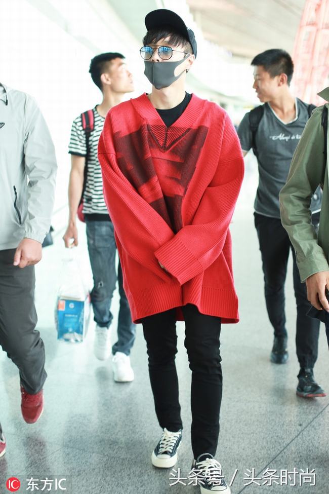 张艺兴红色廓形针织衫时尚潮男,半透明墨镜 棒球帽帅气型男。
