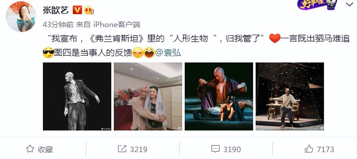 除了有胡歌等好友现身支持自己话剧外,就在今日,张歆艺还发文晒出老公袁弘话剧演出现场照,她表示:“我宣布,《弗兰肯斯坦》里的‘人形生物’,归我管了”,一言既出驷马难追,又被二姐撒“狗粮”了,好甜。
