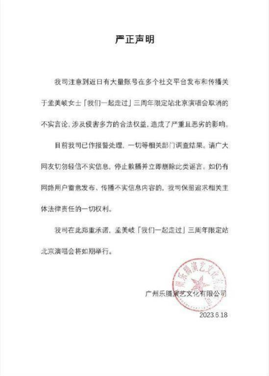 6月18日,孟美岐工作室发布声明,否认了孟美岐演唱会将取消的谣言。“我司注意到近日有大量账号在多个社交平台发布和传播关于孟美岐女士‘我们一起走过’三周年限定站北京演唱会取消的不实言论,涉及侵害多方的合法权益,造成了严重且恶劣的影响。目前我司已作报警处理,一切等相关部门调查结果。”