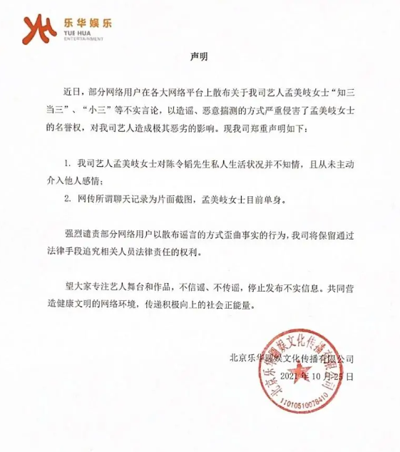 同日,孟美岐所属公司乐华娱乐发布严正声明。同日下午,孟美岐回应恋情风波,承认与陈令韬短暂交往过,两人确实曾一起同游林芝,但目前已经分手了。