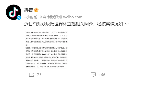 日前,有观众反馈抖音在世界杯直播时出现了杂音,抖音官方今日发布了回应公告,经核实情况如下。