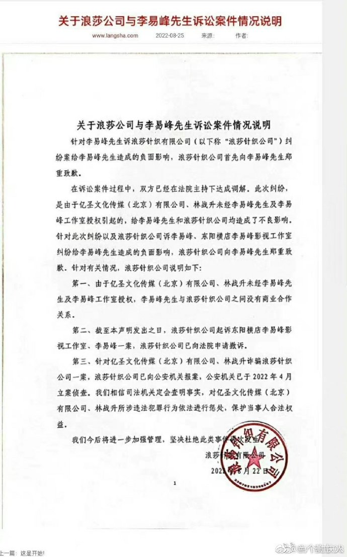 声明指出,浪莎起诉李易峰及其工作室一案已经向法院申请撤诉,同时针对亿圣文化传媒(北京)有限公司、林战升诈骗浪莎一案,已经向公安机关报案,公安机关已于2022年4月立案侦查。此前,“李易峰及工作室被浪莎起诉”一事引发热议。(一文/文)