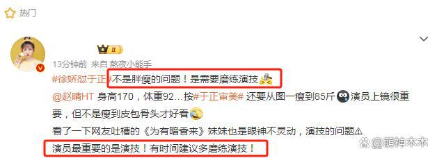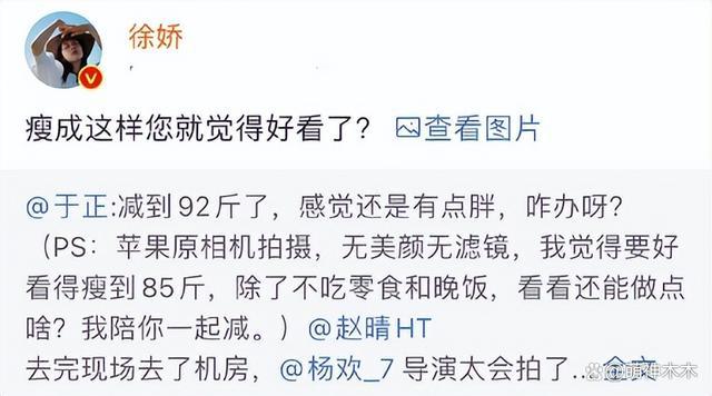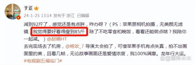 可重点并不在这儿,于正在顺带宣传新剧的同时,还不忘专门 cue 到旗下演员赵晴,感叹已经瘦到 92 斤的赵晴还是太胖,尤其是在无美颜无滤镜的原相机镜头下还是显得不太好看,于正直言赵晴要继续减肥,起码要瘦到 85 斤才算好看,他直接艾特了赵晴,还表示自己要和她一起减。