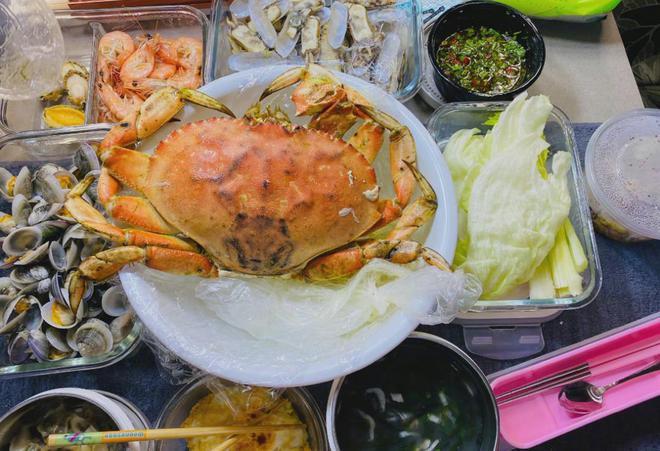 但也有放纵的时候,桌子上摆满海鲜,还不忘搭配蔬菜,很有烟火气,很难想象吃过这么多美食的关晓彤会推广植物肉和魔芋面。