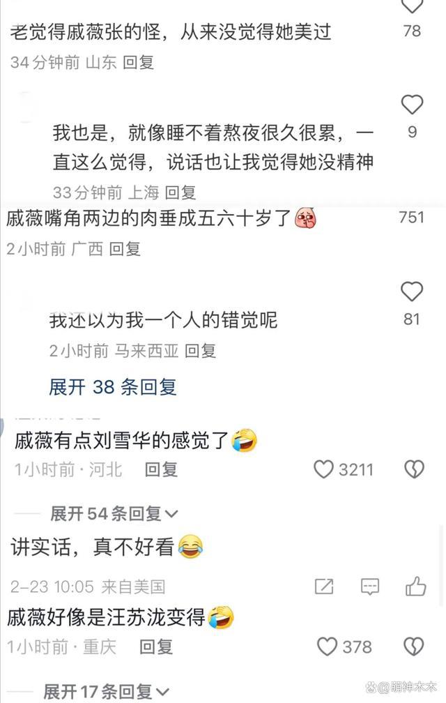 对于戚薇的现场状态,网友启动吐槽,直言如今的戚薇太瘦了,导致整个人干瘪老气,跨脸明显,即便是化妆大神也难救场。更有犀利的网友吐槽戚薇撞脸老年刘雪华和汪苏泷。
