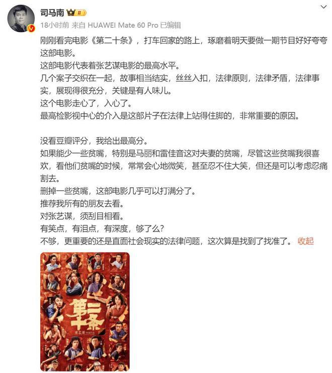 知名大 V 司马南也是发文点评《第二十条》,他表示"这部电影代表着张艺谋电影的最高水平"。