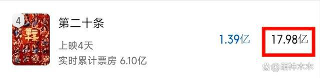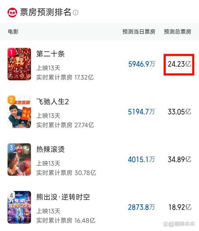 目前,《第二十条》已经连续四天占据日票房冠军的位置,其预测总票房也不断攀升,已经达到了 24 亿,和上映初测预测的 17 亿票房相比进步巨大。虽然还是总票房的第三名,但是到手的票房的确越来越高了。