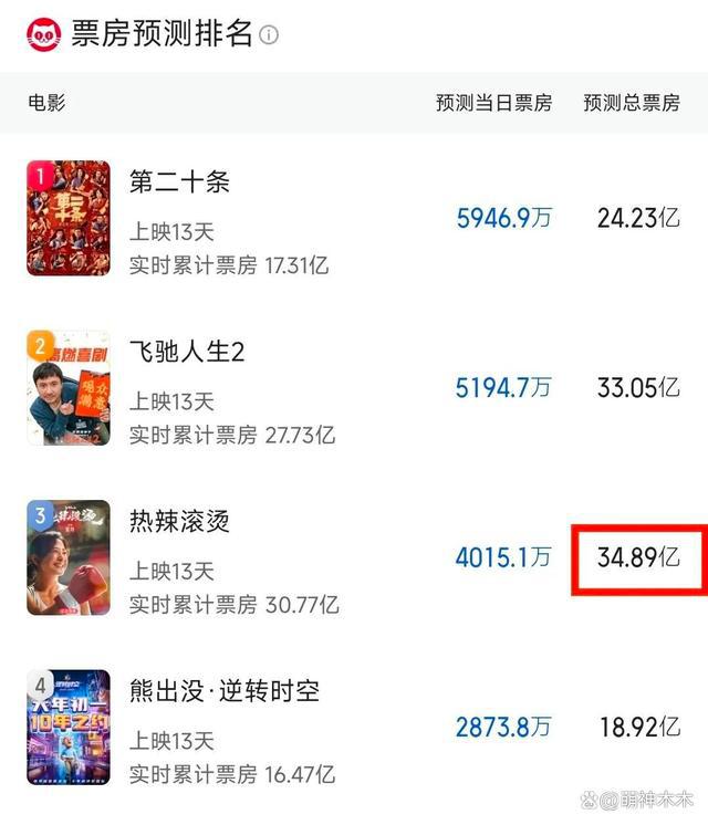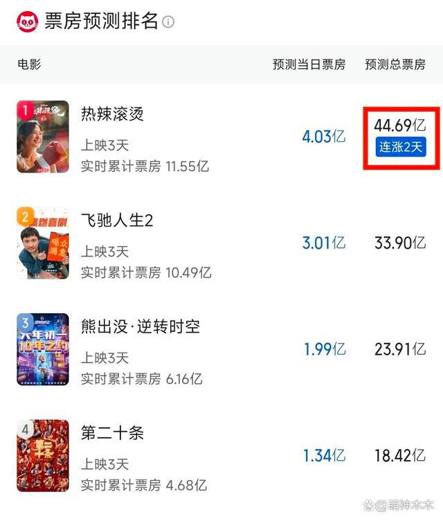 这一局面造成的最直接的影响就是影片票房成绩下滑,《热辣滚烫》不仅从占据多日的日票房冠军的位置上下来了,连最新预测总票房成绩也持续下降,如今是 34 亿左右,和巅峰时期的预测总票房 44 亿,相差了 10 亿,严重缩水。