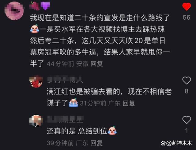 还有网友直接讽刺《第二十条》的宣发路线,指责其 " 一是踩《热辣》,然后夸《二十条》,这几天又天天说自己是单日票房冠军 ",让人不禁想起去年春节档影片《满江后》的宣发套路。