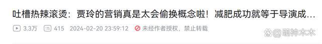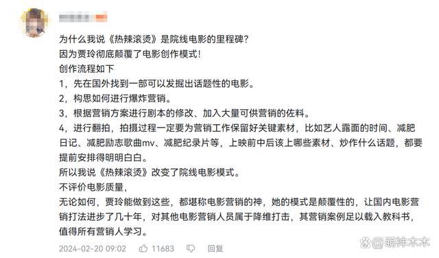 最近,各个平台涌现了许多吐槽《热辣滚烫》的言论,有的发帖吐槽,对电影的质量只字不提,只是逐条分析贾玲创作电影的模式,辣评其是 " 电影营销的神,其营销案例足以载入教科书 "。