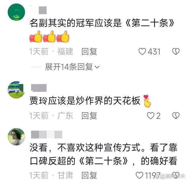 在某平台有关春节档影片的视频评论区,确实出现了网友描述的情况,夸赞《第二十条》的评论是 " 名副其实的冠军应该是《第二十条》",讽刺贾玲炒作的评论是 " 没看,不喜欢这种宣传方式。看了靠口碑反超的《第二十条》,的确好看 ",更直接的评论就是捧一个踩一个了。