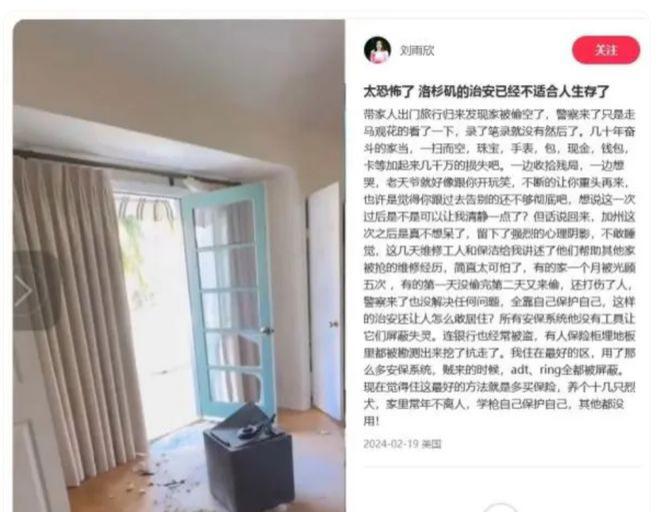2024 年 2 月 19 日,演员刘雨欣带着家人外出旅游,回到洛杉矶的家里后,一打开门,她就吓傻了眼。