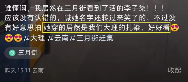 4 月 1 日,一位网友在云南的三月街偶遇了李子柒。网友喊李子柒的名字,她还转过来笑了笑,十分亲和。当天李子柒穿着云南大理的扎染,网友直呼 " 好好看 "。